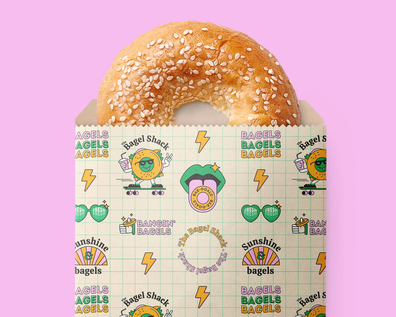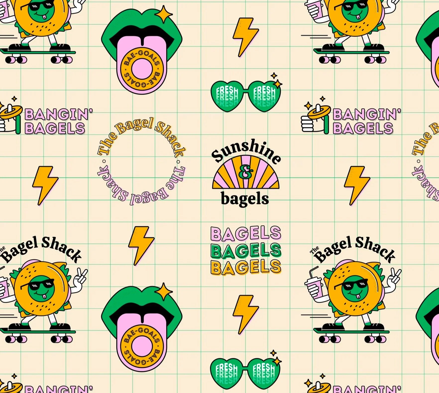 A vibrant, playful brand identity for The Bagel Shack bakery. An experimentation of colour and illustration with a bagel mascot to really showcase the enjoyment of getting together with friends and family over coffee and bagels.