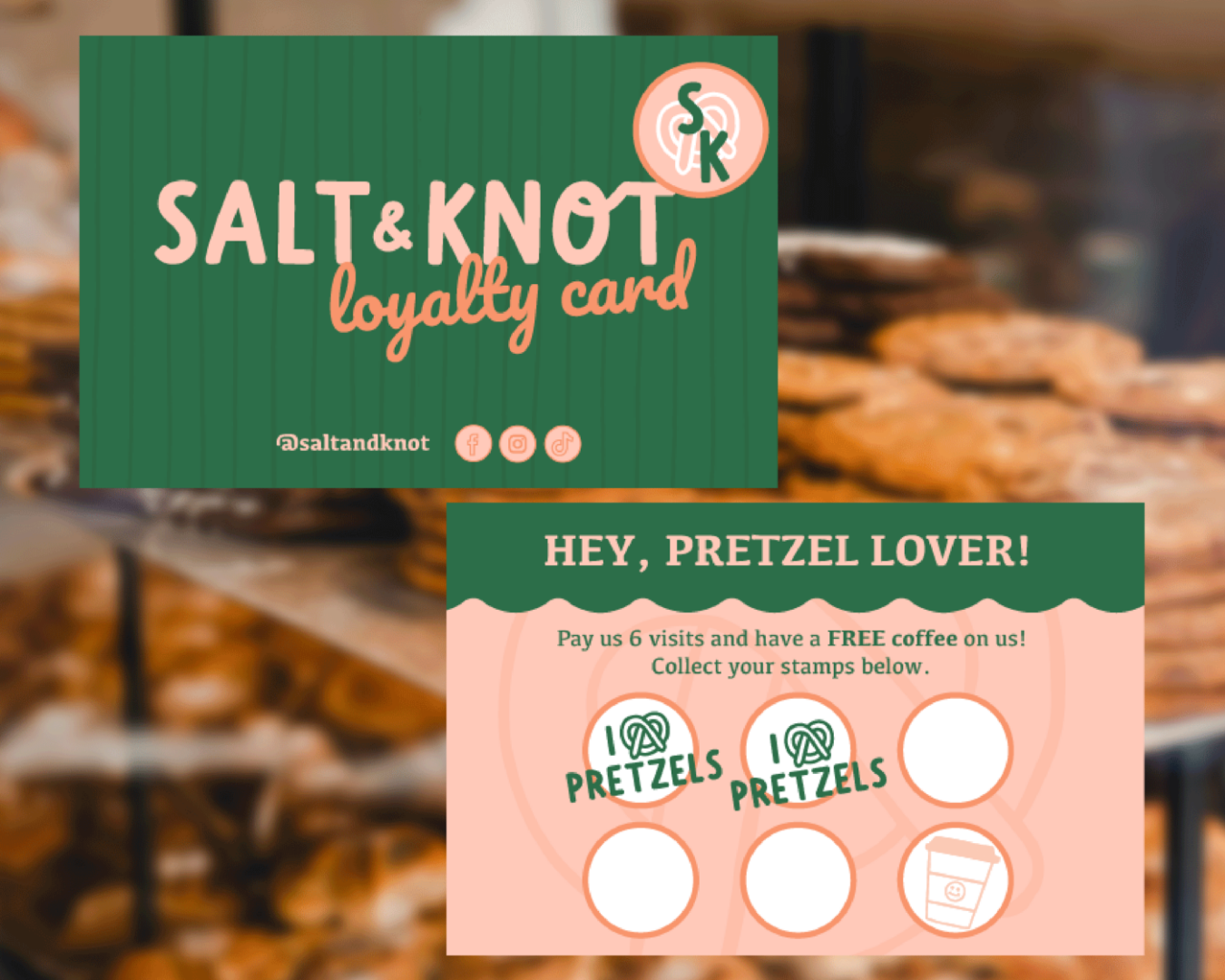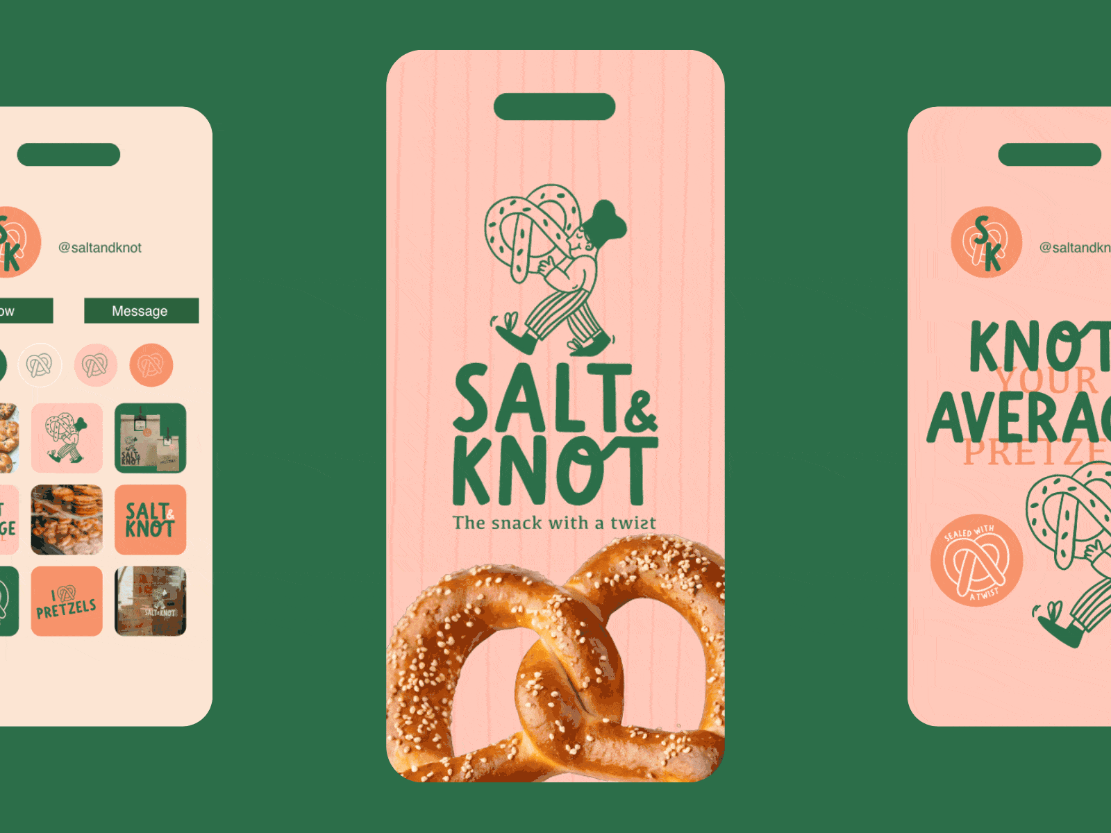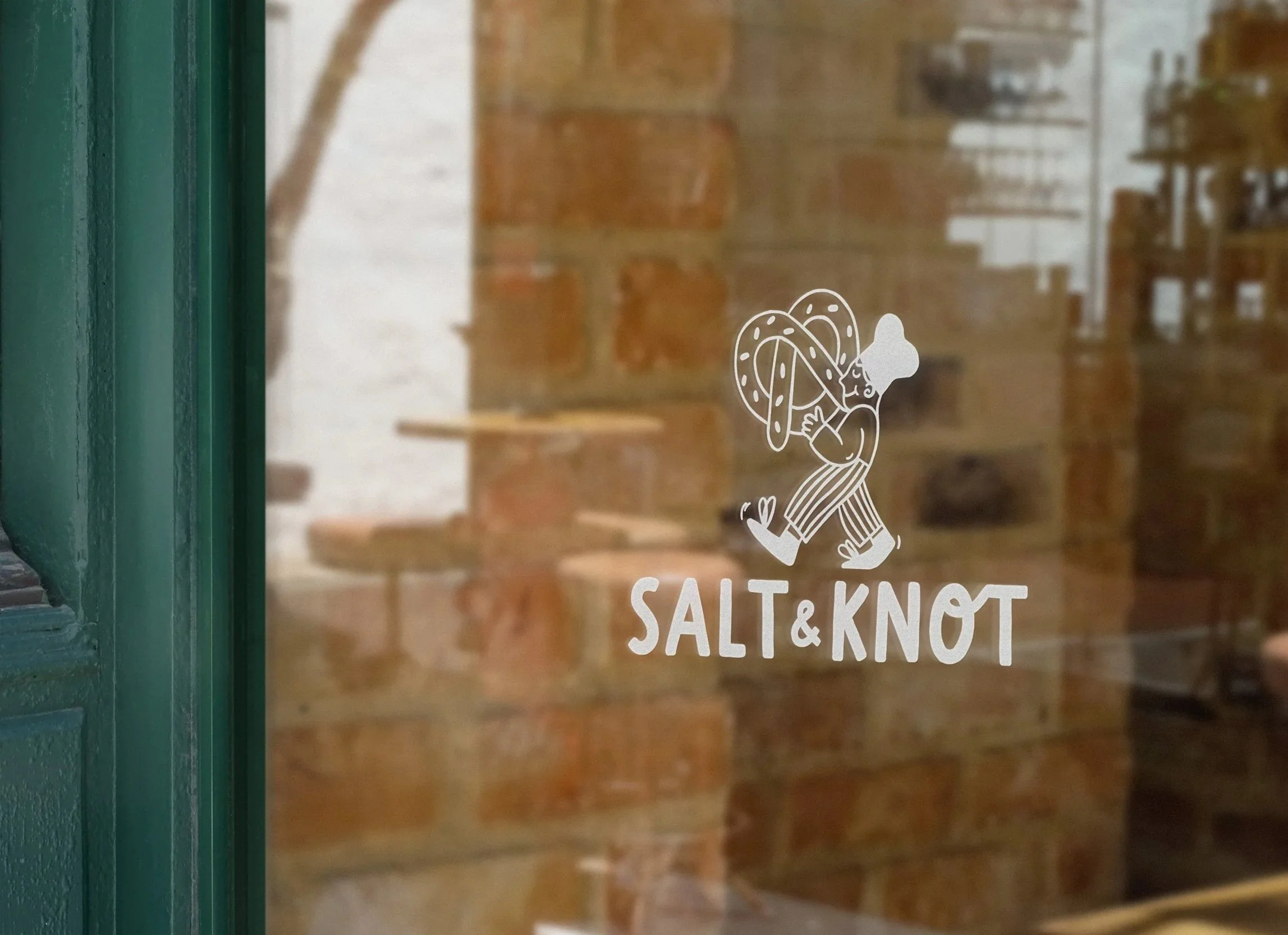 Brand identity, character illustration and brand pattern for Salt & Knot, a trendy, neighbourhood pretzel bakery that prides itself on its tradition and passion for baking.